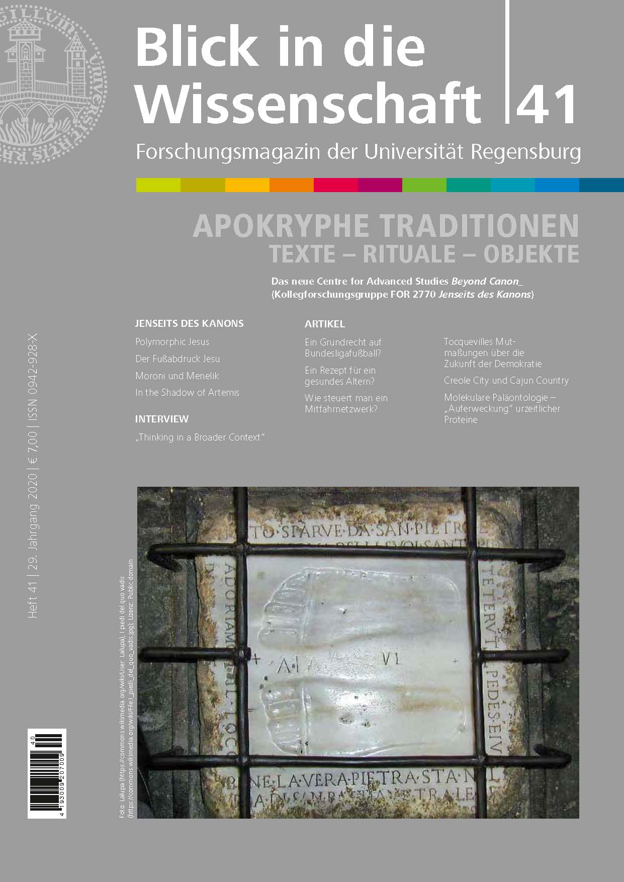 Schwerpunkt unseres aktuellen „Blick in die Wissenschaft“ sind Texte, Riten und Dinge, die mit apokryphen Traditionen in Verbindung stehen und eine besondere Wirksamkeit im kirchlichen Leben entfaltet haben. In fünf Beiträgen und einem Interview werfen Autorinnen und Autoren des Centre for Advanced Studies (Kollegforschungsgruppe FOR 2770) der Fakultät für Katholische Theologie einen Blick Jenseits des Kanons und auf den besonderen Reiz dieses Forschungskollektivs. Interessantes erfahren wir über Tocquevilles Mutmaßungen über die Zukunft der Demokratie und Creole City und Cajun Country sind unser Reiseziel. Wir gehen den Fragen nach einem Grundrecht auf Bundesligafußball, nach dem Rezept für gesundes Altern und nach der Steuerung eines Mitfahrnetzwerks auf den Grund. Lassen Sie sich am Schluss zeigen, wie in der Molekularen Paläontologie die „Auferweckung“ urzeitlicher Proteine von statten geht.